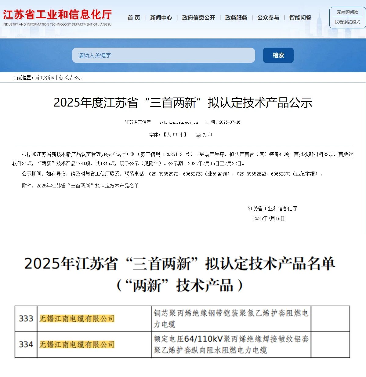 近日,江蘇省工信廳公示2025年度江蘇省“三首兩新”擬認定技術產品名單,無錫江南電纜有限公司“銅芯聚丙烯絕緣鋼帶鎧裝聚氯乙烯護套阻燃電力電纜”和“額定電壓64/110kV聚丙烯絕緣焊接皺紋鋁套聚乙烯護套縱向阻水阻燃電力電纜”被認定為“兩新”技術產品。